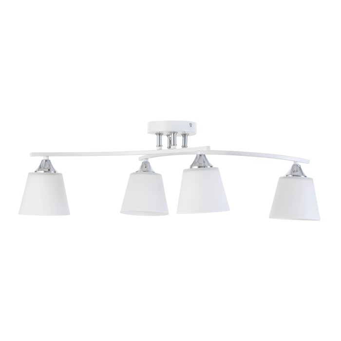 Вид лампы|Накаливания;Количество ламп|4;Стиль|Эконом;Цоколь|E27;Длина, см|70.5;Ширина, см|32.5;Высота, см|21;Минимальная высота от потолка, см|21;Максимальная высота от потолка, см|21;Мощность на цоколь, Вт|60;Степень защиты|IP20;Назначение по помещениям|Гостиная;Назначение по помещениям|Большой зал;Материал основания|Металл;Цвет основания|Белый;Тип рассеивателя|Плафон;Особенности светильника|Линии;Тип подвеса|Без подвеса (потолочный);Оттенок рассеивателя|Светлые тона;Материал рассеивателя|Стекло;Управление светильником|Без выключателя;Подходит для натяжных потолков|Да (при использования светодиодных ламп);Плоская|Нет;Тип крепления|На планку;Форма рассеивателя|Конусный;Направление рассеивателя|Вниз;Цвет рассеивателя|Матовый белый;Стиль|Классика;Тип источника освещения|Лампа не в комплекте;
