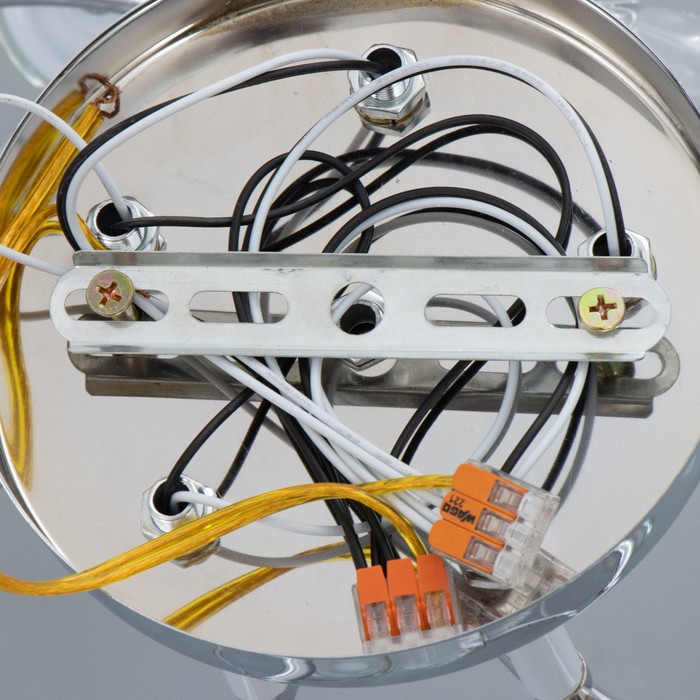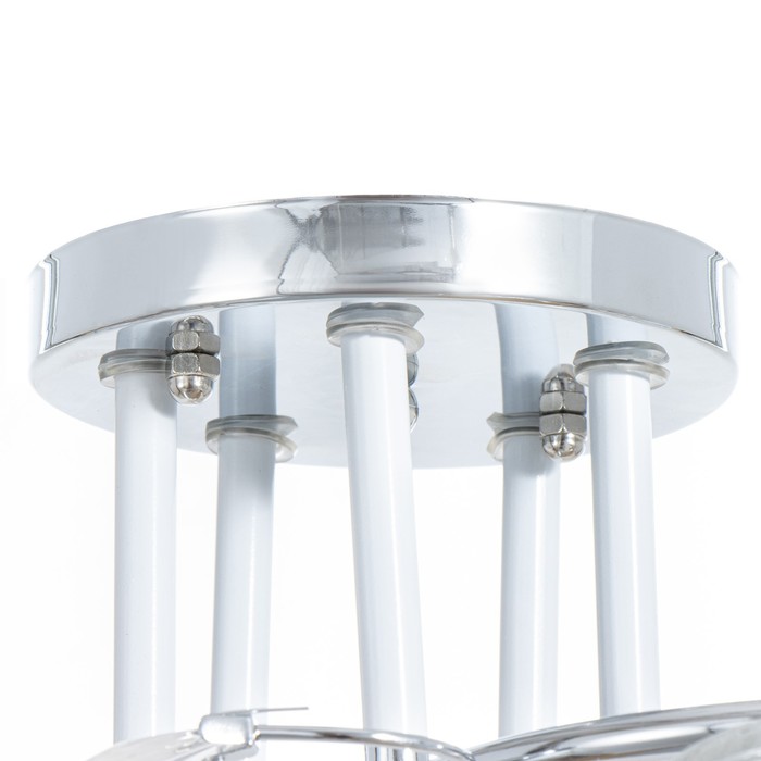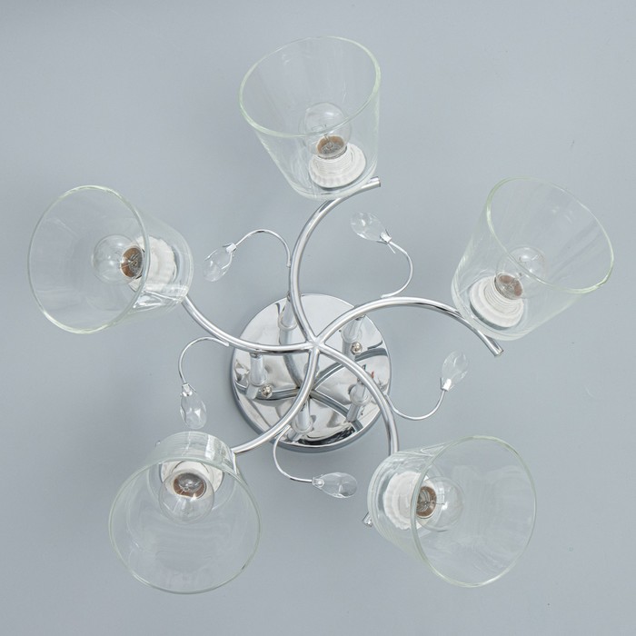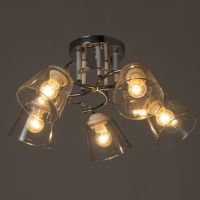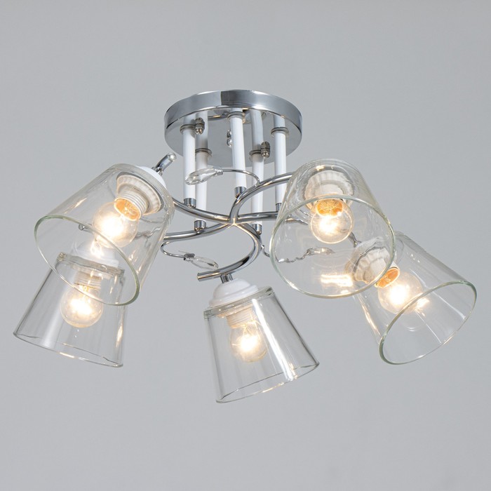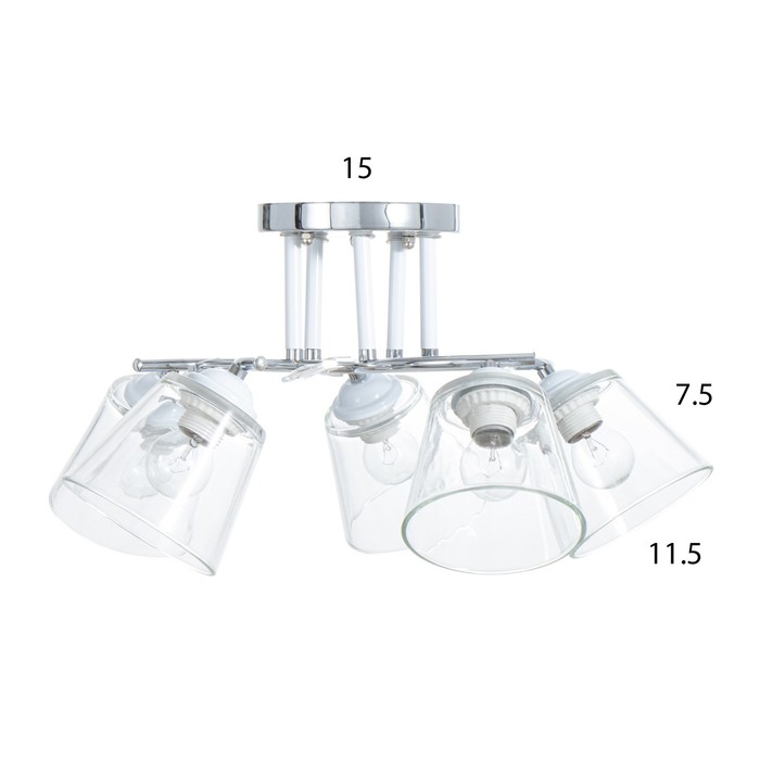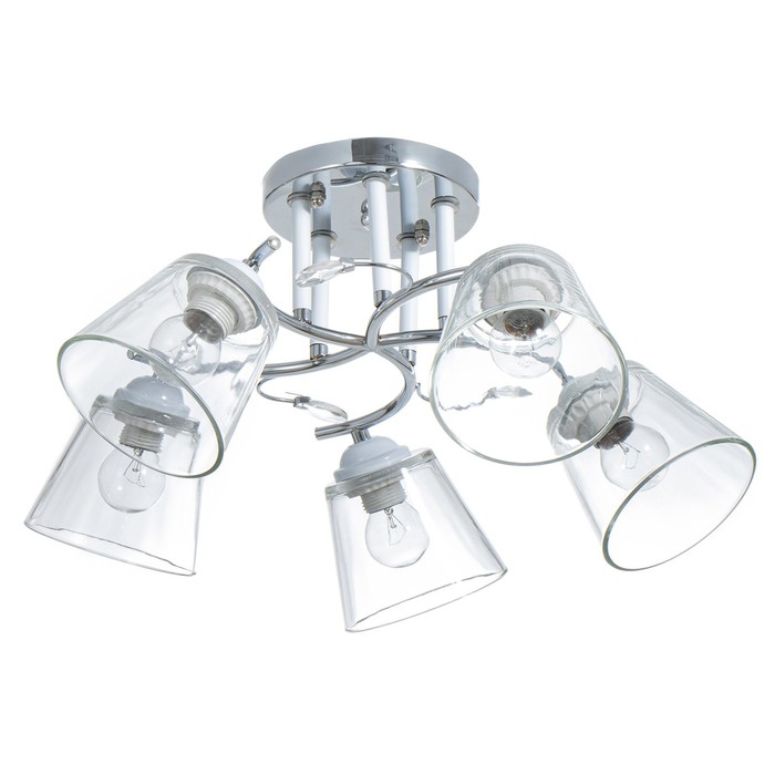 Вид лампы|Светодиодная;Вид лампы|Накаливания;Количество ламп|5;Стиль|Эконом;Цоколь|E27;Длина, см|58;Ширина, см|58;Высота, см|27;Площадь освещения, м²|10;Мощность на цоколь, Вт|40;Степень защиты|IP20;Назначение по помещениям|Гостиная;Назначение по помещениям|Спальня;Материал основания|Металл;Цвет основания|Хром;Тип рассеивателя|Плафон;Оттенок рассеивателя|Светлые тона;Материал рассеивателя|Стекло;Управление светильником|Без выключателя;Подходит для натяжных потолков|Да (при использования светодиодных ламп);Плоская|Нет;Тип крепления|На планку;Форма рассеивателя|Призма;Направление рассеивателя|В стороны;Направление рассеивателя|Вниз;Цвет рассеивателя|Белый;Стиль|Минимализм;Тип источника освещения|Лампа не в комплекте;