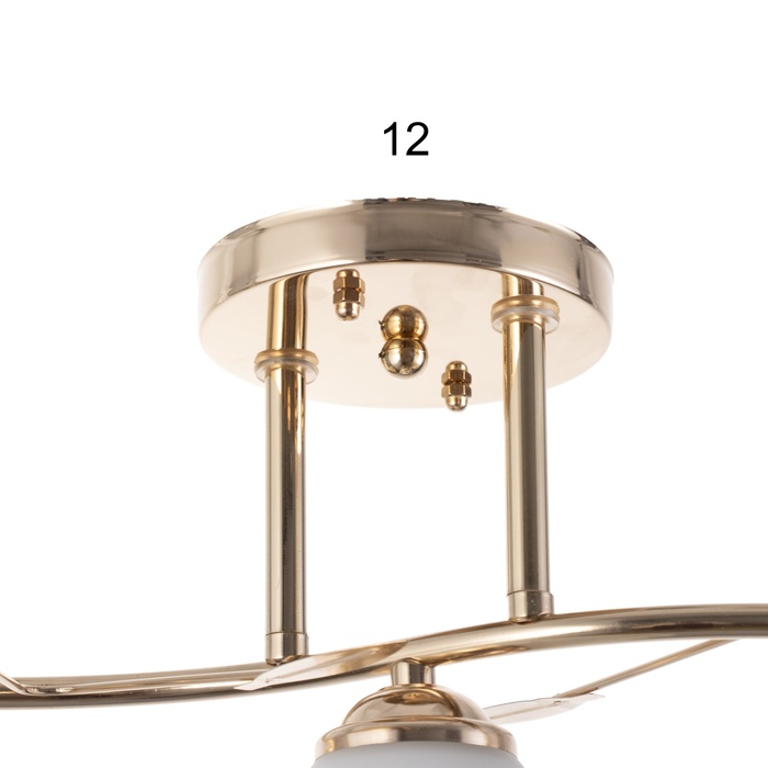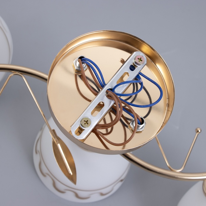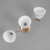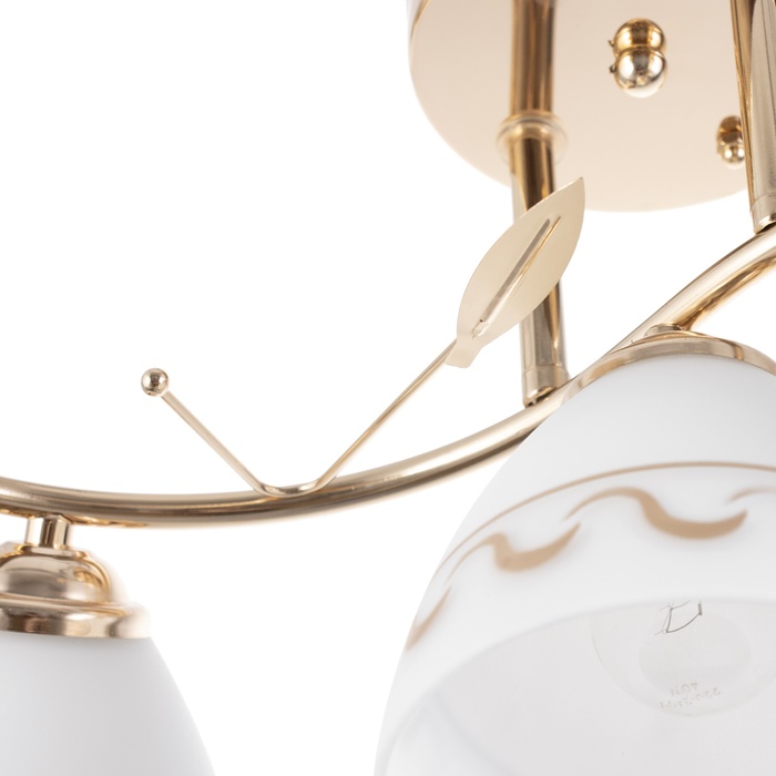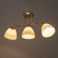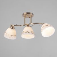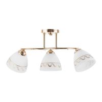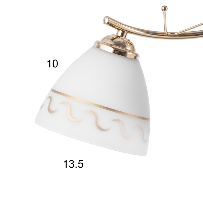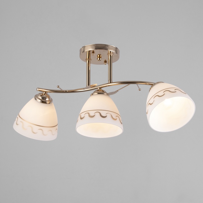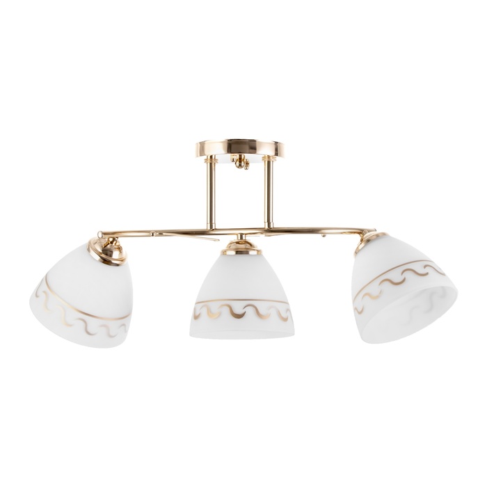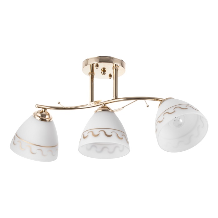 Вид лампы|Накаливания;Количество ламп|3;Стиль|Эконом;Цоколь|E27;Длина, см|58;Ширина, см|15;Высота, см|26;Площадь освещения, м²|6;Минимальная высота от потолка, см|26;Максимальная высота от потолка, см|26;Мощность на цоколь, Вт|40;Степень защиты|IP20;Назначение по помещениям|Спальня;Назначение по помещениям|Прихожая;Назначение по помещениям|Коридор;Назначение по помещениям|Кухня;Материал основания|Металл;Цвет основания|Золотой;Тип рассеивателя|Плафон;Особенности светильника|Узор;Тип подвеса|Штанга;Оттенок рассеивателя|Светлые тона;Материал рассеивателя|Стекло;Управление светильником|Без пульта;Подходит для натяжных потолков|Да (при использования светодиодных ламп);Плоская|Нет;Тип крепления|На планку;Форма рассеивателя|Конусный;Направление рассеивателя|Вниз;Цвет рассеивателя|Матовый белый;Стиль|Современный;Тип источника освещения|Лампа не в комплекте;
