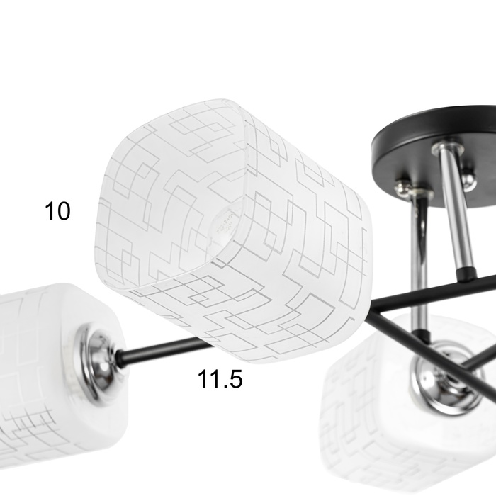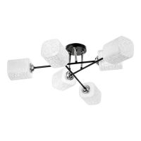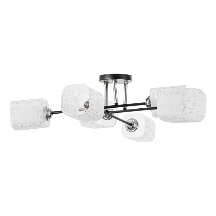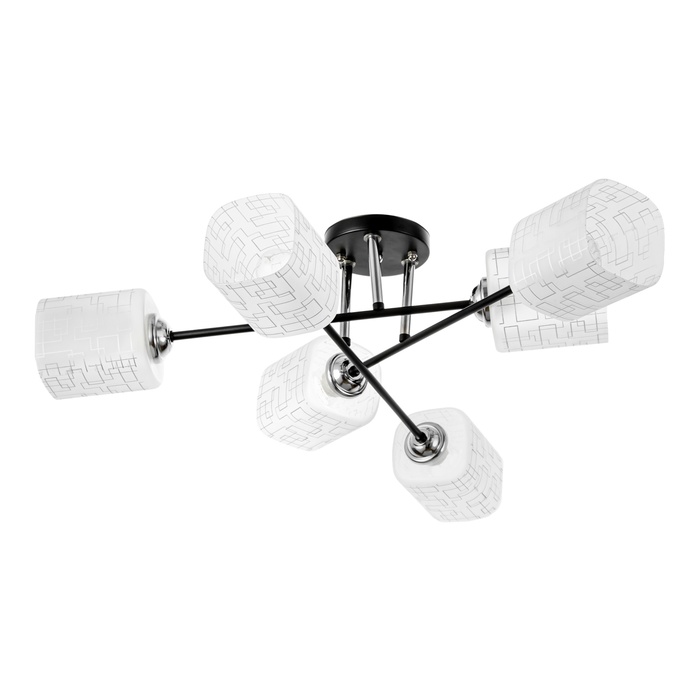 Вид лампы|Накаливания;Количество ламп|6;Стиль|Модерн и хайтек;Цоколь|E27;Длина, см|62;Ширина, см|62;Высота, см|28;Площадь освещения, м²|12;Минимальная высота от потолка, см|28;Максимальная высота от потолка, см|28;Мощность на цоколь, Вт|40;Степень защиты|IP20;Назначение по помещениям|Гостиная;Назначение по помещениям|Большой зал;Материал основания|Металл;Цвет основания|Хром;Цвет основания|Чёрный;Тип рассеивателя|Плафон;Тип подвеса|Штанга;Оттенок рассеивателя|Светлые тона;Форма|Линии;Материал рассеивателя|Стекло;Управление светильником|Без пульта;Подходит для натяжных потолков|Да (при использования светодиодных ламп);Плоская|Нет;Тип крепления|На планку;Форма рассеивателя|Прямоугольный;Направление рассеивателя|В стороны;Цвет рассеивателя|Матовый белый;Стиль|Современный;Тип источника освещения|Лампа не в комплекте;