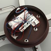 Изделие выполнено из качественного металла, пластика и светодиодов. Срок службы люстры в домашних условиях — 20 000 часов. Подходит для помещений с низкими потолками и для натяжных потолков. Осветит комнату площадью до 14 м?.