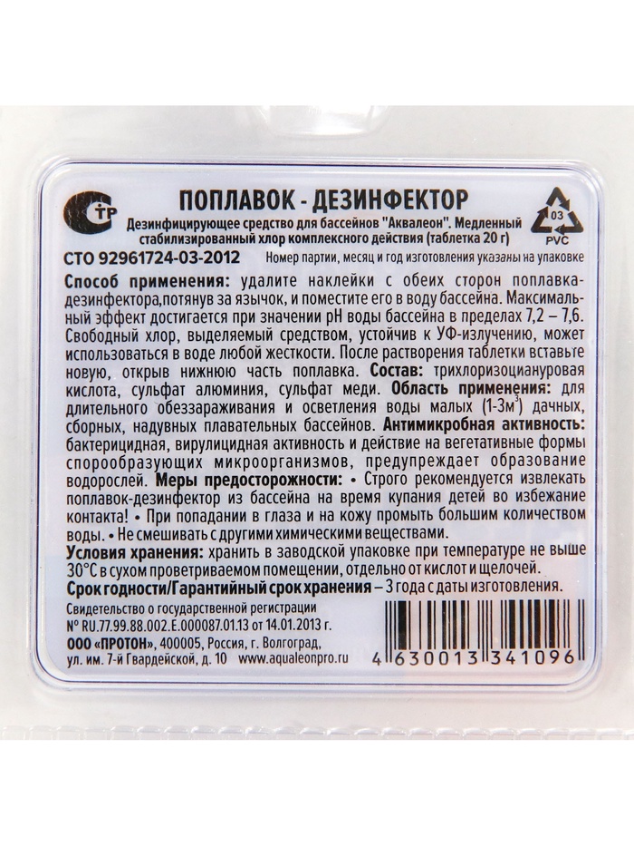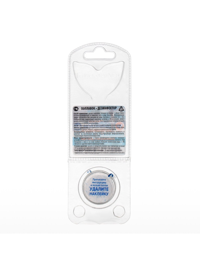 Меры предосторожности: строго рекомендуется извлекать поплавок-дезинфектор из бассейна на время купания детей во избежание контакта. При попадании в глаза и на кожу, промыть большим количеством воды. Не смешивать с другими химическими веществами.