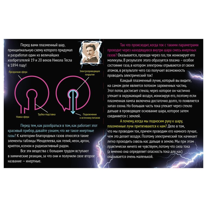 Ребёнок интересуется научными экспериментами? Предложите ему понаблюдать за плазменной лампой! Внутри набора вы найдёте инструкцию с интересными фактами о физике, токе, инертных газах и первом учёном, который придумал и разработал схему работы плазменного шара!
