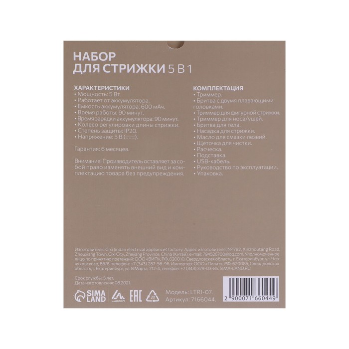 Набор для стрижки Luazon LTRI-07, 5 в 1, 5 Вт, 5 насадок, триммер, АКБ, чёрный