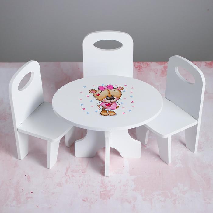 Цвет|Белый;Для кого|Для девочки;Возраст|От 3 лет;Вид упаковки|Коробка картонная;Тематика праздника|8 Марта;Материал|Дерево;Дополнительные функции|Развивающая;Назначение|Для кухни/столовой;Подходит по размеру для кукольного домика|Да;Вид|Столы;Вид|Стул;