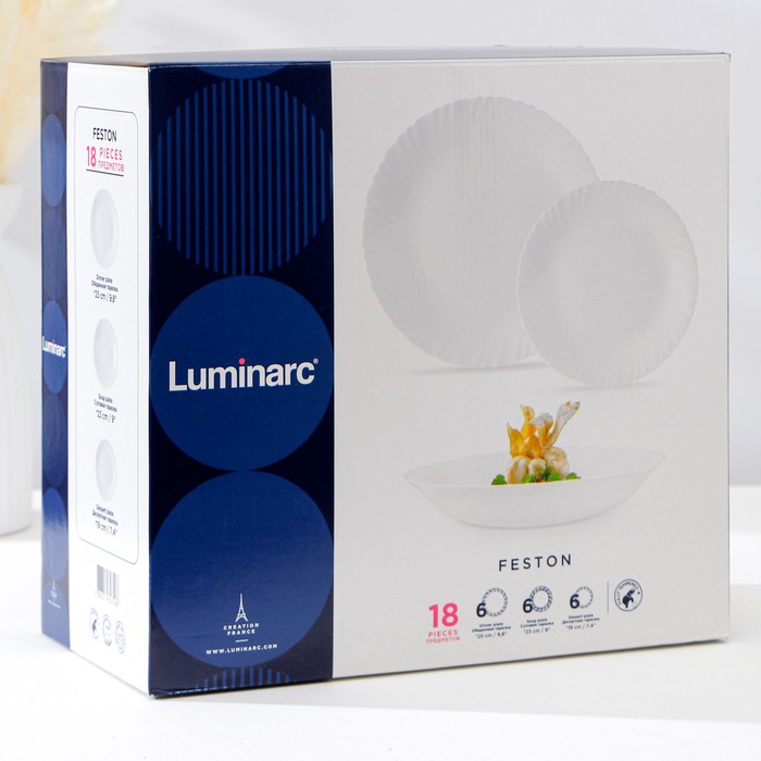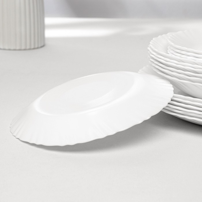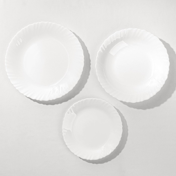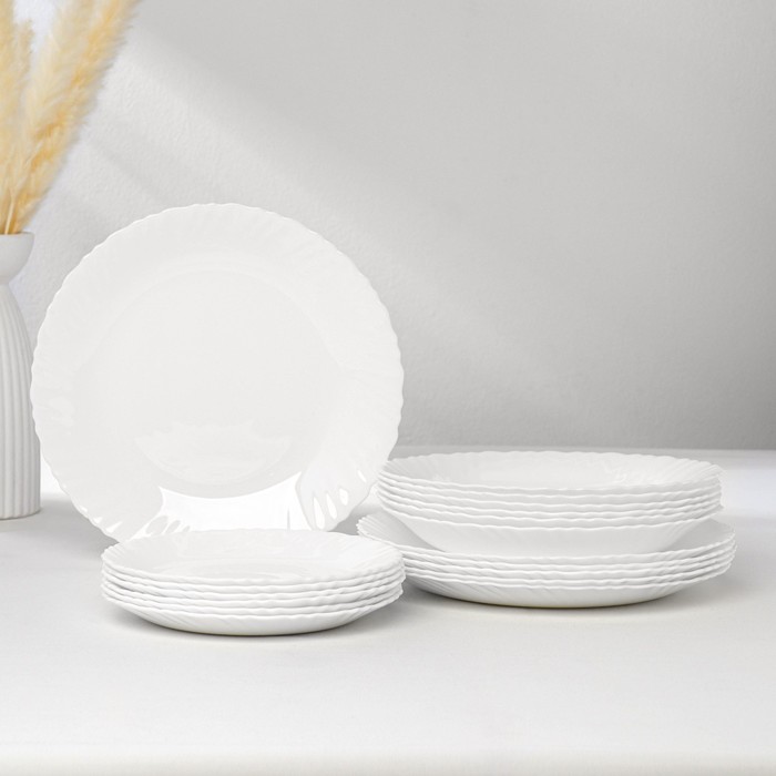 Цвет|Белый;Количество персон|6;В наборе, шт.|18;Тематика|Однотонная;Рисунок|Нет;Материал|Стеклокерамика;Вид тарелки|Плоская;Вид тарелки|Глубокая;Можно мыть в посудомоечной машине|Да;Можно использовать в СВЧ-печи|Да;Текстура|Гладкая;Особенности|Без особенностей;Для горячего|Да;