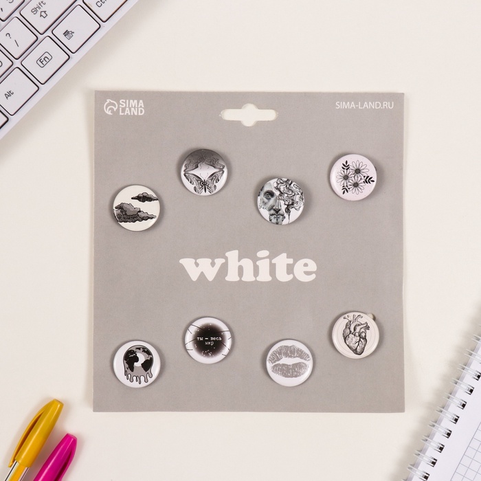 Набор значков на одежду, рюкзак, сумку «Белые», 8 шт., d=25 мм, закатные, 16.5?17 см