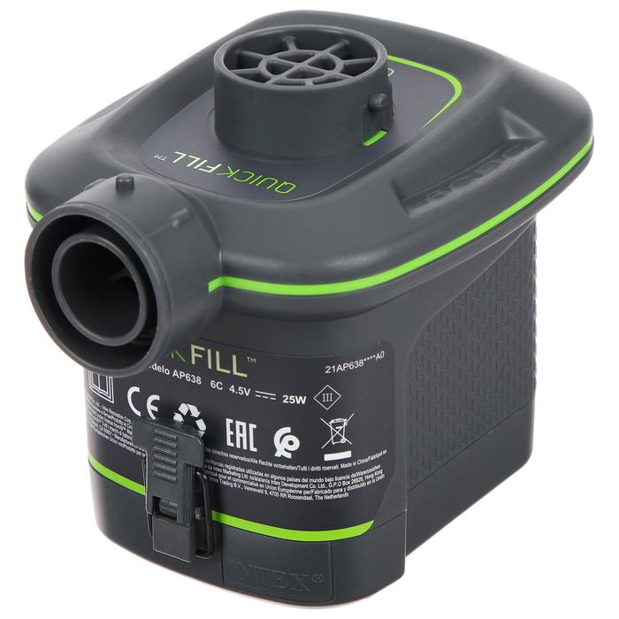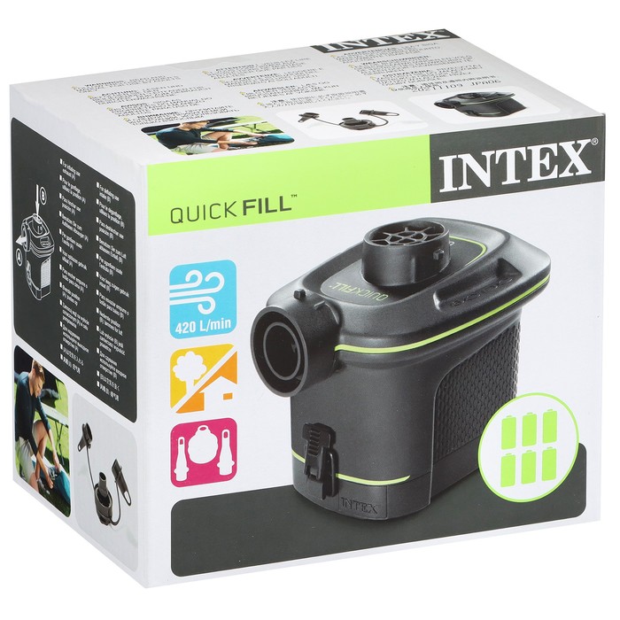 Для работы насоса необходимо 6 шт батареек или аккумуляторов Тип С. При помощи данного насоса можно накачивать или сдувать любые надувные изделия производства Intex. Насос удобно брать с собой в поездки и на природу, где нет электрической сети. В комплекте 3 насадки. Размер: 11 см ? 15 см ? 13 см. Продуктивность - 420л/мин.