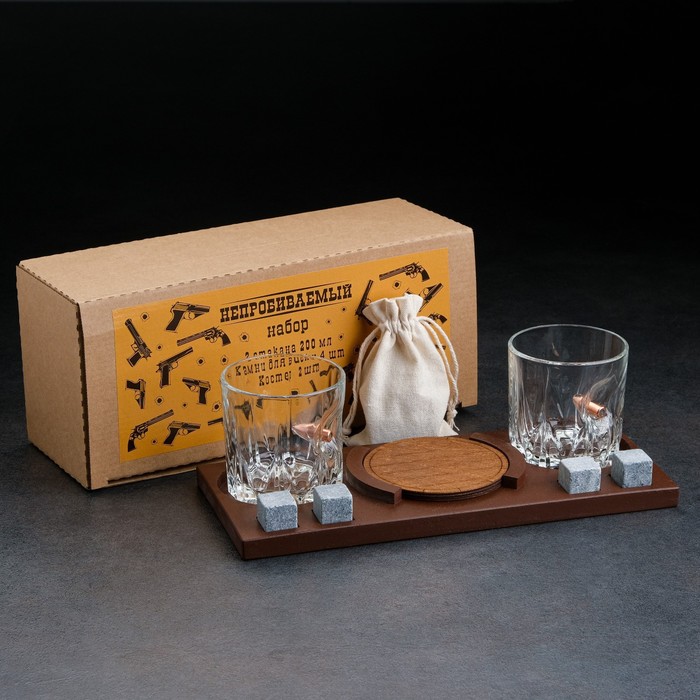 Подарочный набор «Непробиваемый»: 2 стакана 200 мл, камни для виски 4 шт, подставка