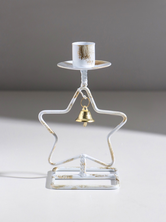 Изящное сочетание звезды и колокольчика в этом подсвечнике создает волшебную атмосферу зимних праздников. Металлическая конструкция с благородной белой патиной придает изделию винтажный шарм, делая его стильным украшением рождественского интерьера.