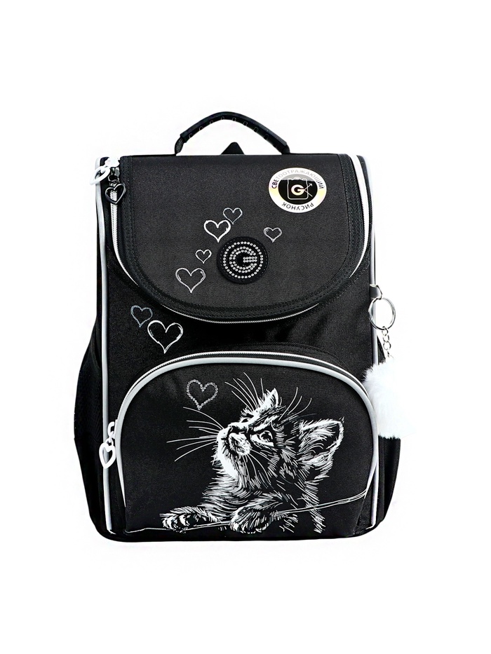 - Дизайн с изображением кота: яркое изображение делает ранец привлекательным для детей, способствует развитию интереса к учебе и самостоятельности.