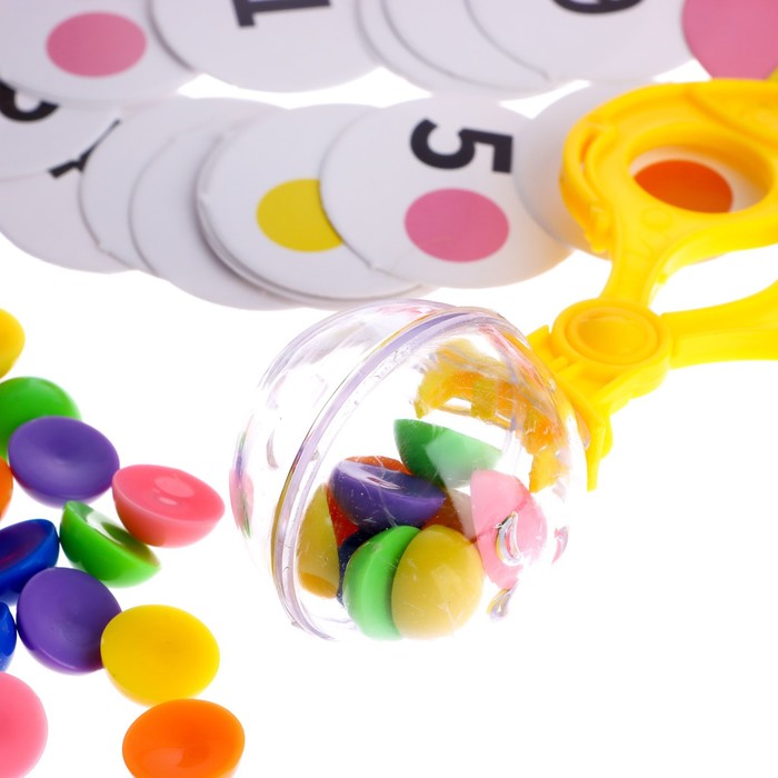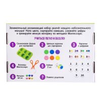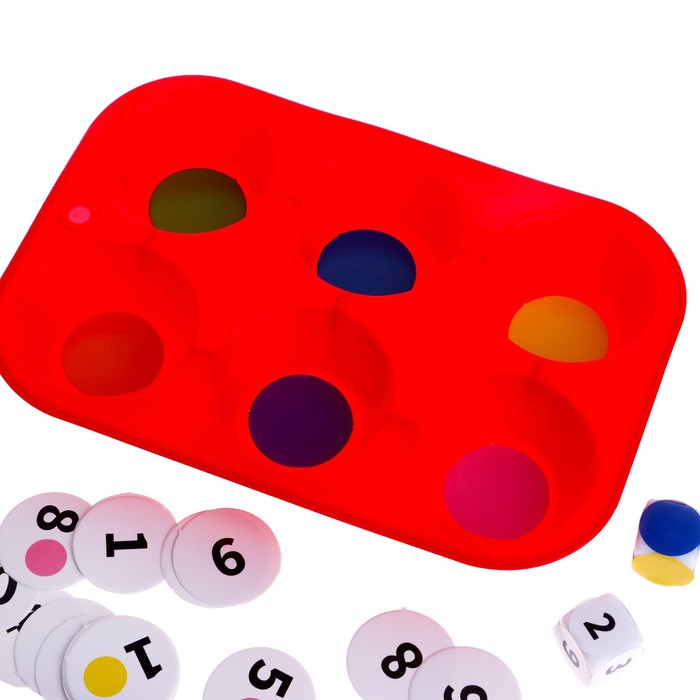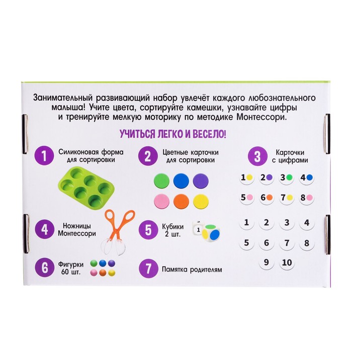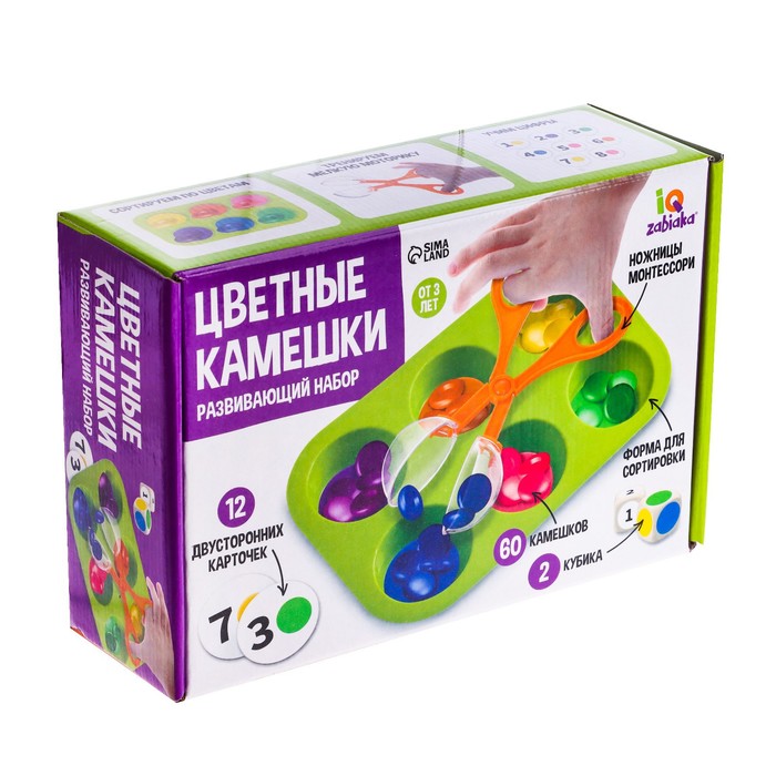 В комплект входит форма для сортировки, 12 карточек с заданиями, 60 камешков, 2 кубика.