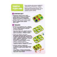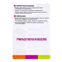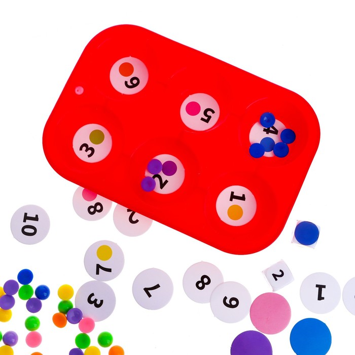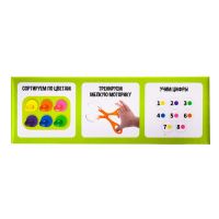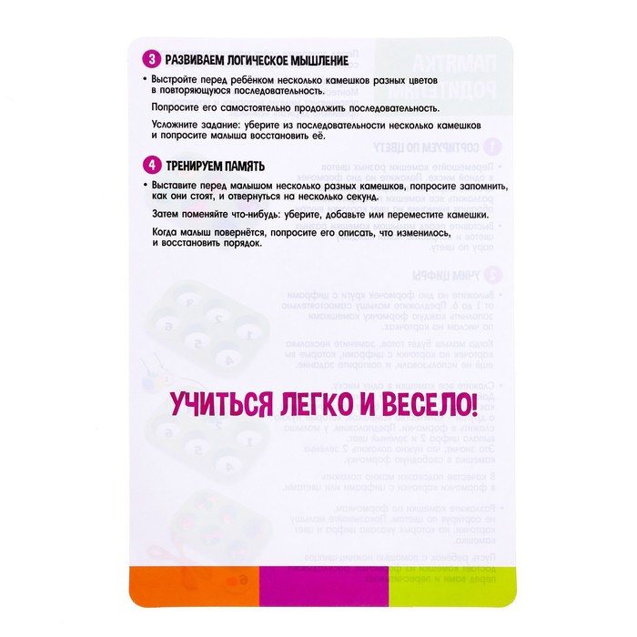 В комплект входит форма для сортировки, 12 карточек с заданиями, 60 камешков, 2 кубика.