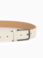 Широкий белый ремень с серебряной пряжкой — свежий акцент для летнего гардероба. Классическая ширина подчеркивает талию, сохраняя элегантную сдержанность. Искусственная кожа с матовой поверхностью устойчива к повседневной носке.