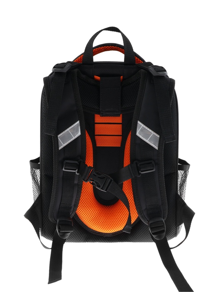 Плотная спинка с анатомическими элементами дополнительно укреплена пластиком, сверху – дышащая трехслойная сетка. Лямки-маечка плотные, мягкие. Регулируются по длине и высоте, что позволяет без труда отрегулировать их по росту ребенка. Ранец снабжен надежным нагрудным фиксатором и двумя боковыми карманами из прочной сетки. Есть удобная мягкая ручка для переноски и дополнительная петлевая ручка для размещения ранца на крюке