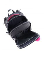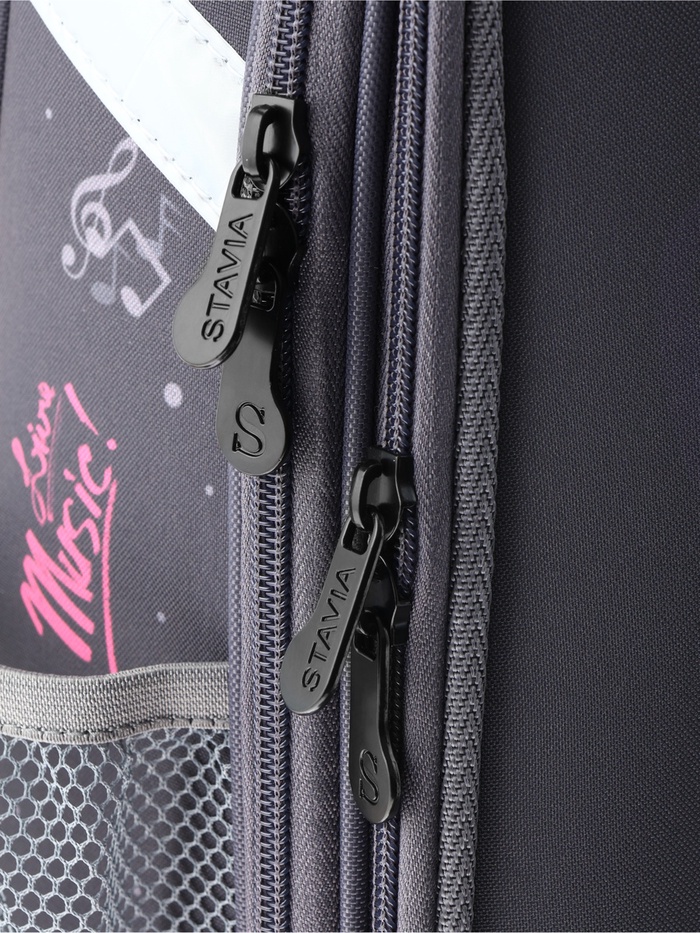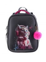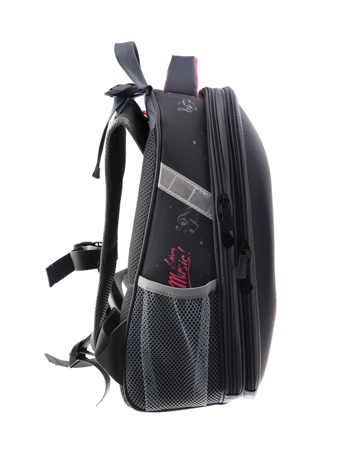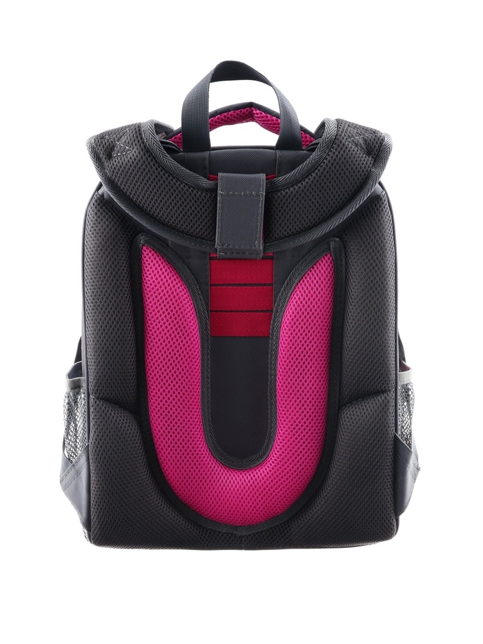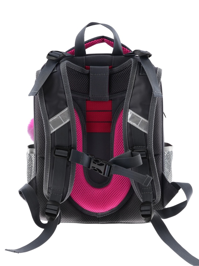 Плотная спинка с анатомическими элементами дополнительно укреплена пластиком, сверху – дышащая трехслойная сетка. Лямки-маечка плотные, мягкие. Регулируются по длине и высоте, что позволяет без труда отрегулировать их по росту ребенка. Ранец снабжен надежным нагрудным фиксатором и двумя боковыми карманами из прочной сетки. Есть удобная мягкая ручка для переноски и дополнительная петлевая ручка для размещения ранца на крюке. На дне ранца есть две пластиковые ножки. В соответствии с требованиями к безопасности на дороге, ранец имеет светоотражающие элементы на лямках и корпусе. Приятный бонус — колечко-подвес для брелока. Брелок также прилагается.