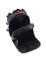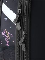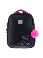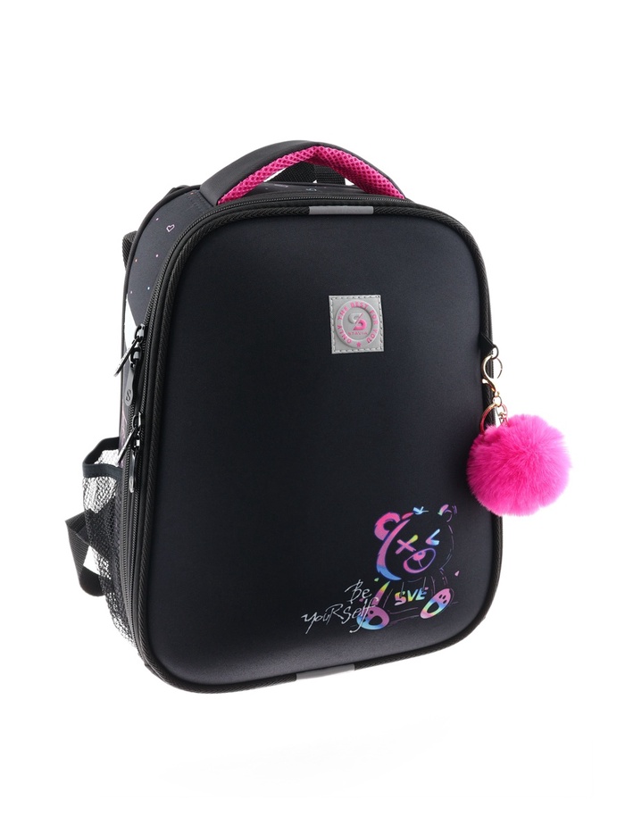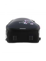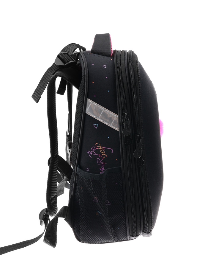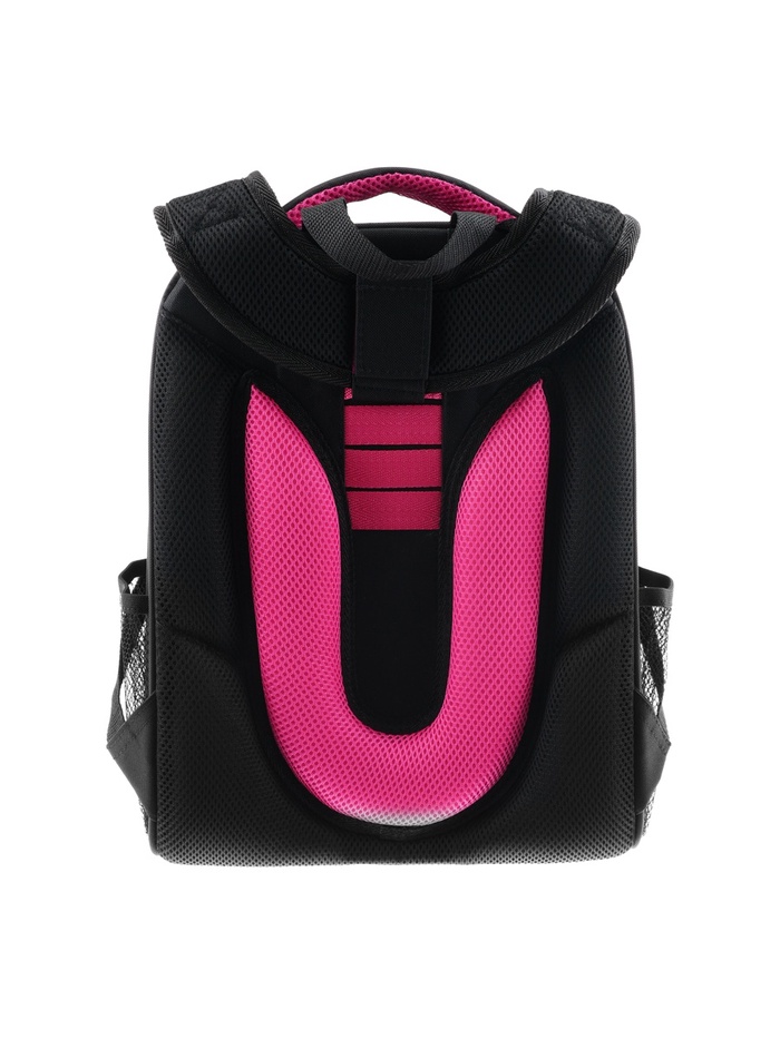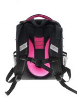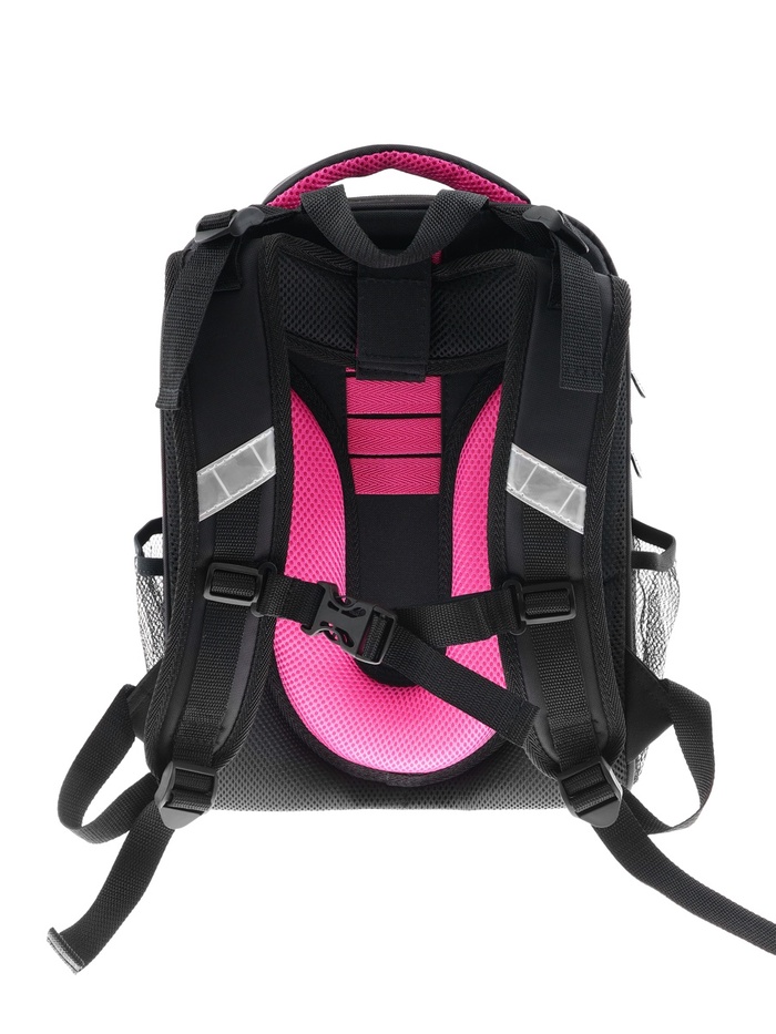 Плотная спинка с анатомическими элементами дополнительно укреплена пластиком, сверху – дышащая трехслойная сетка. Лямки-маечка плотные, мягкие. Регулируются по длине и высоте, что позволяет без труда отрегулировать их по росту ребенка. Ранец снабжен надежным нагрудным фиксатором и двумя боковыми карманами из прочной сетки. Есть удобная мягкая ручка для переноски и дополнительная петлевая ручка для размещения ранца на крюке. На дне ранца есть две пластиковые ножки. В соответствии с требованиями к безопасности на дороге, ранец имеет светоотражающие элементы на лямках и корпусе. Приятный бонус — колечко-подвес для брелока. Брелок также прилагается.