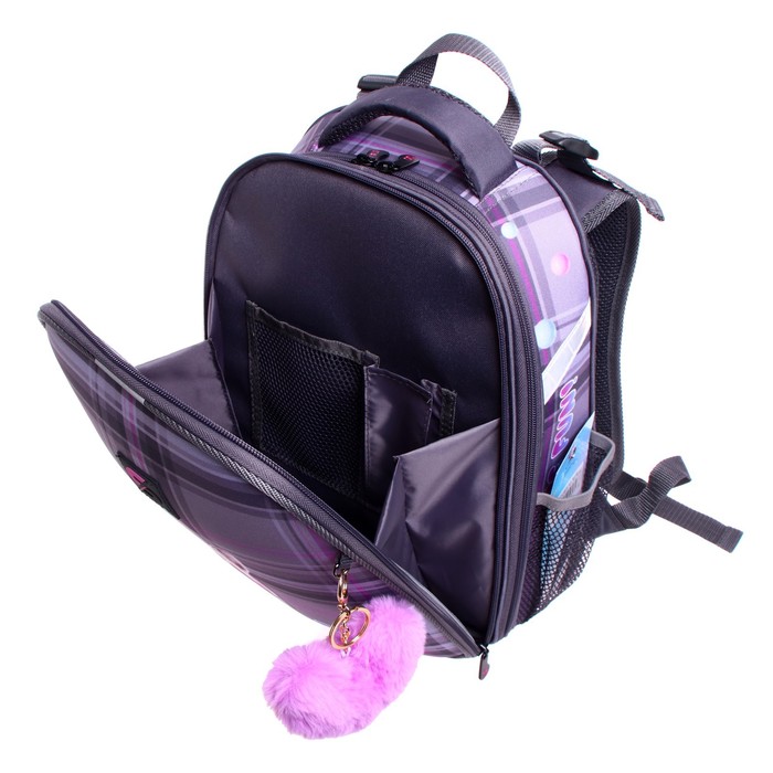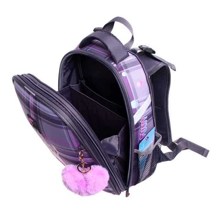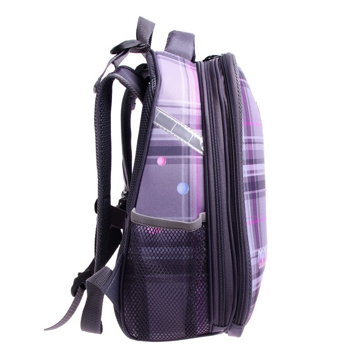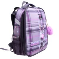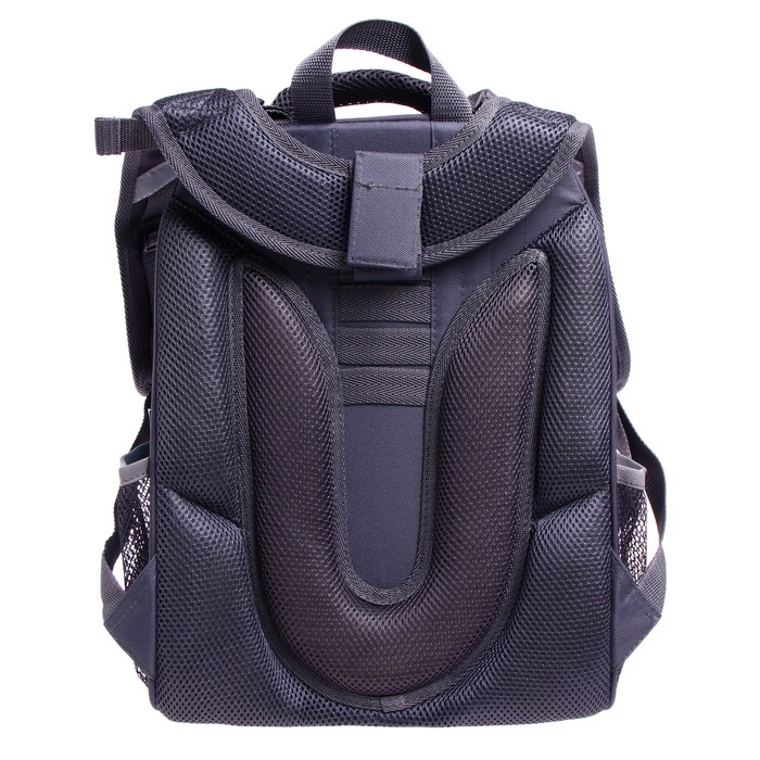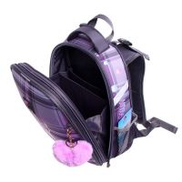 Ранец изготовлен из формованного EVA-материала и высокопрочного непромокаемого полиэстера. Размер 30 х 38 х 16 см. Вес 900 г. Прочные формованные стенки и дно ранца позволяют надежно защитить содержимое от влаги, загрязнений и предотвращают его замятие. Ранец с двумя вместительными отделениями, закрывающимися на реверсивную пластиковую молнию с металлическими «бегунками»; в первом — «плавающие» перегородки для тетрадей и учебников, во втором – большой карман из сетки и карманы-органайзеры для канцелярских принадлежностей. Плотная спинка с анатомическими элементами дополнительно укреплена пластиком, сверху – дышащая трехслойная сетка. Лямки-маечка плотные, мягкие. Регулируются по длине и высоте, что позволяет без труда отрегулировать их по росту ребенка. Ранец снабжен надежным нагрудным фиксатором. Есть удобная мягкая ручка для переноски и дополнительная петлевая ручка для размещения ранца на крюке. На дне ранца есть две пластиковые ножки. В соответствии с требованиями к безопасности на дороге, ранец имеет светоотражающие элементы на лямках и корпусе.