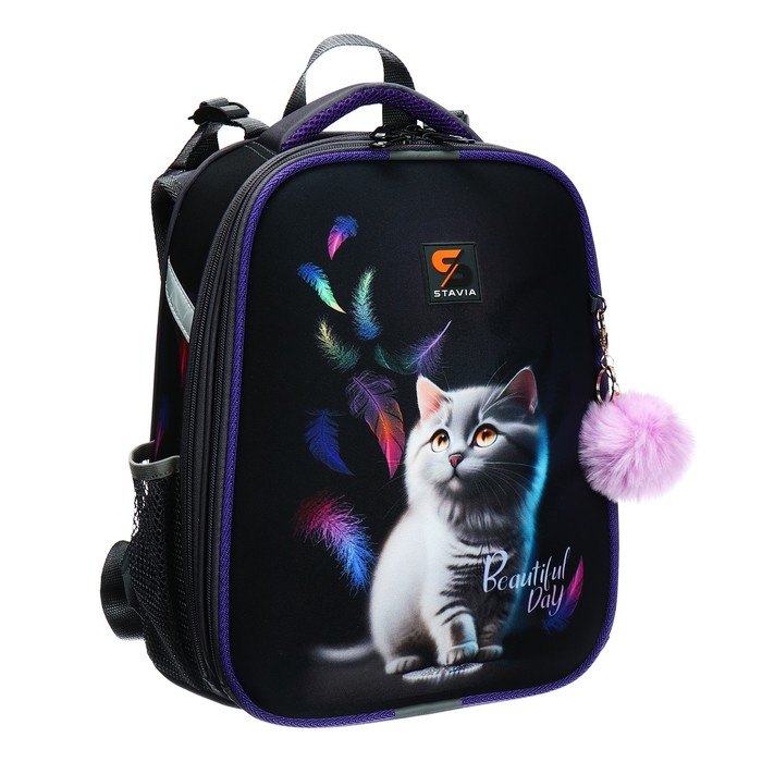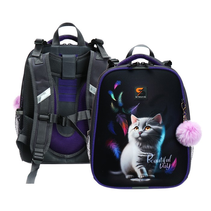 Рюкзак каркасный школьный 38 х 30 х 16 см, эргономичная спинка, Stavia "Кот и перья", синий