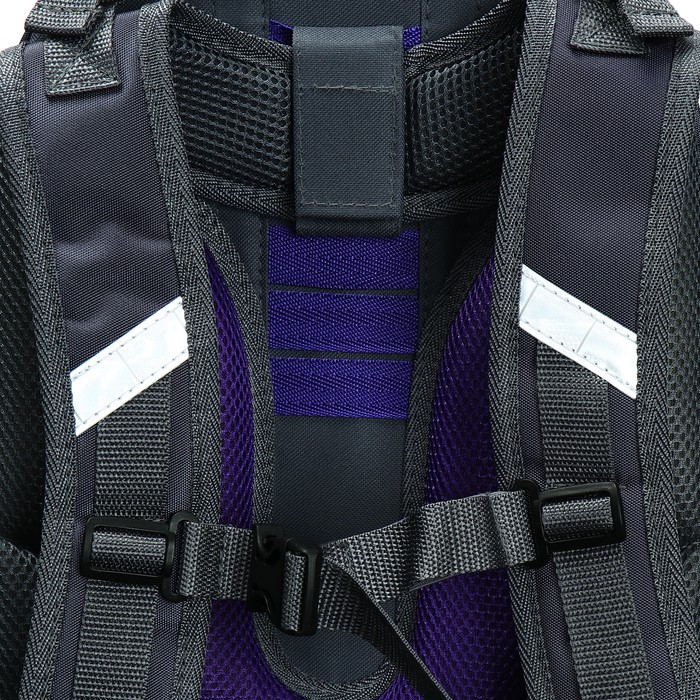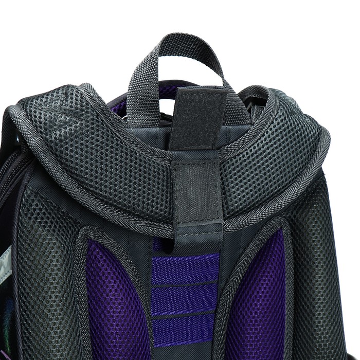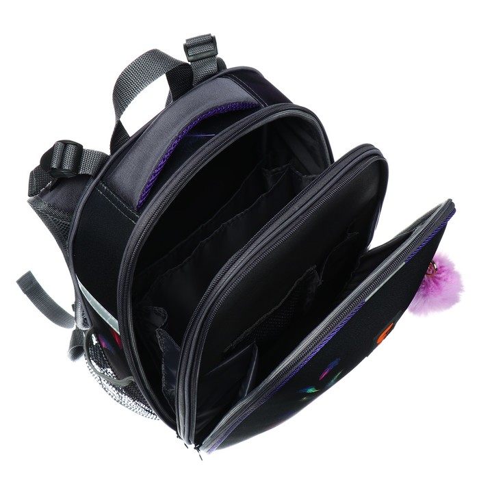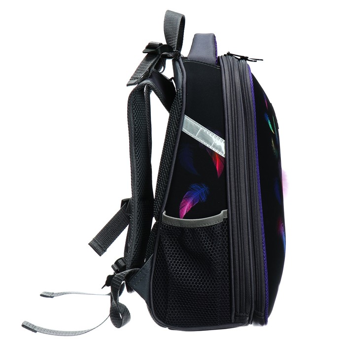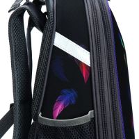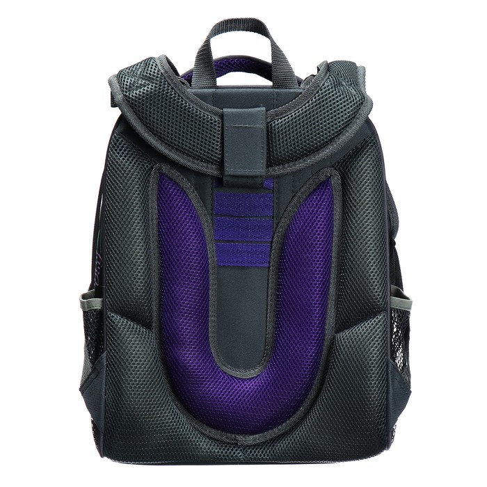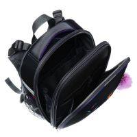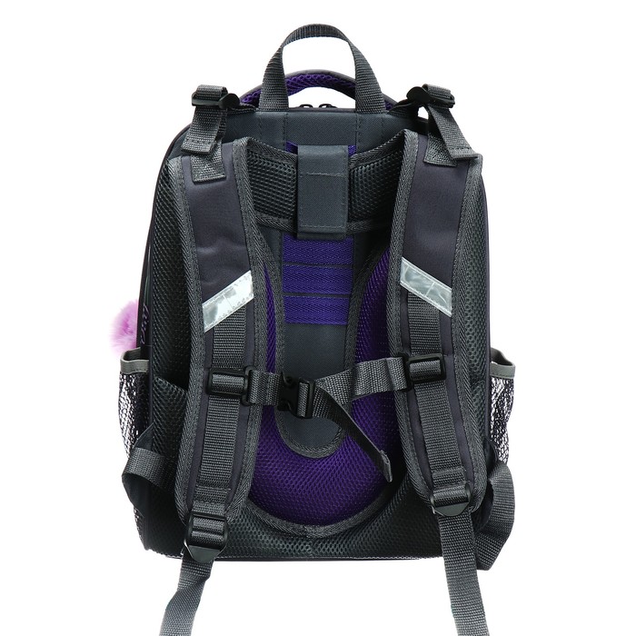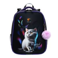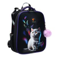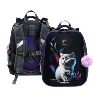 Ранец из формованного EVA-материала и высокопрочного непромокаемого полиэстера. Два вместительных отделения на реверсивной пластиковой молнии; в первом — «плавающие» перегородки для тетрадей и учебников, во втором – большой карман из сетки и карманы-органайзеры. Спинка с анатомическими элементами дополнительно укреплена пластиком, сверху – дышащая трехслойная сетка. Лямки-маечка плотные, мягкие. Регулируются по длине и высоте. Ранец снабжен нагрудным фиксатором и двумя боковыми карманами из прочной сетки. Есть мягкая ручка для переноски и дополнительная петлевая ручка для размещения ранца на крюке. На дне две пластиковые ножки. Ранец имеет светоотражающие элементы на лямках и корпусе. Брелок в комплекте.