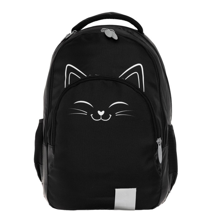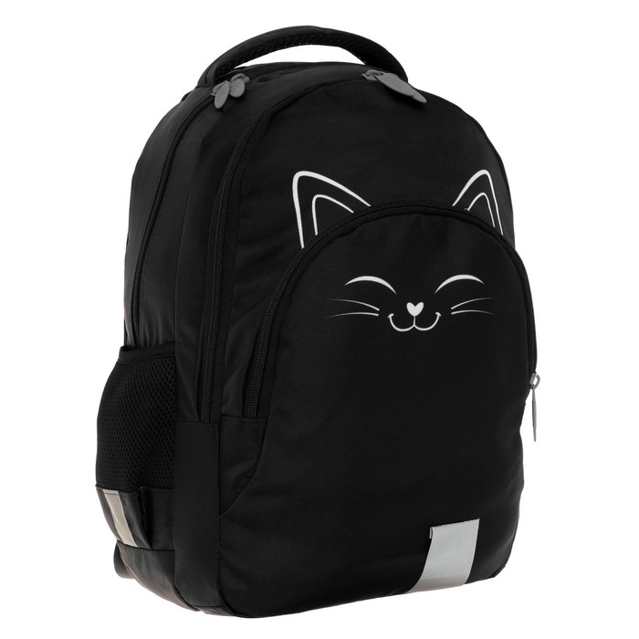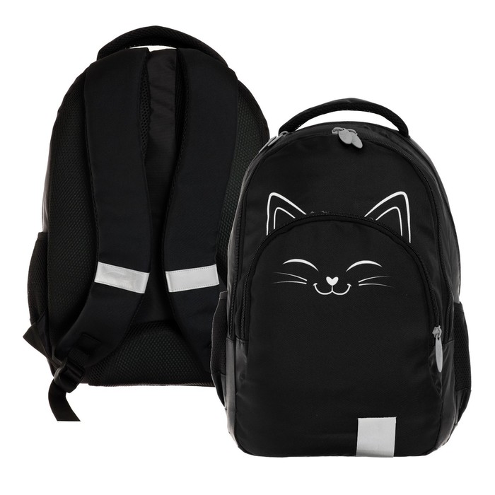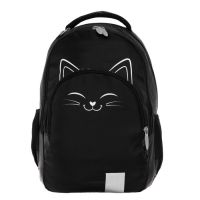 Набор|Нет;Цвет|Чёрный;Для кого|Для девочки;Возраст|5-11 класс;Особенности ранцев|Жёсткая эргономичная спинка;Количество лямок|2;Количество отделений|3;Лицензия|Нет;Вид застёжки|Молния;Тематика|Животный мир;Рисунок|Да;Материал|Полиэстер;Тип|Рюкзак мягкий;Штрихкод на единице товара|Да;Изображение|Кот/Кошка;Стиль|Классический;Размер|Более 20 литров (большой);