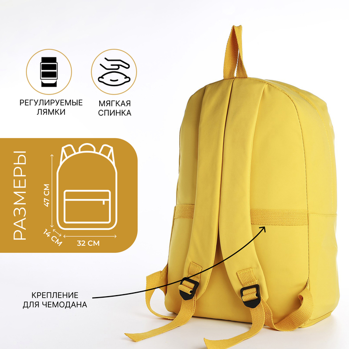 Набор|Нет;Цвет|Жёлтый;Для кого|Для девочки;Возраст|5-11 класс;Особенности ранцев|Крепление для чемодана;Особенности ранцев|Мягкая спинка;Количество лямок|2;Вид застёжки|Молния;Рисунок|Нет;Материал|Текстиль;Тип|Рюкзак мягкий;Изображение|Без рисунка;Стиль|Классический;Размер|Более 20 литров (большой);