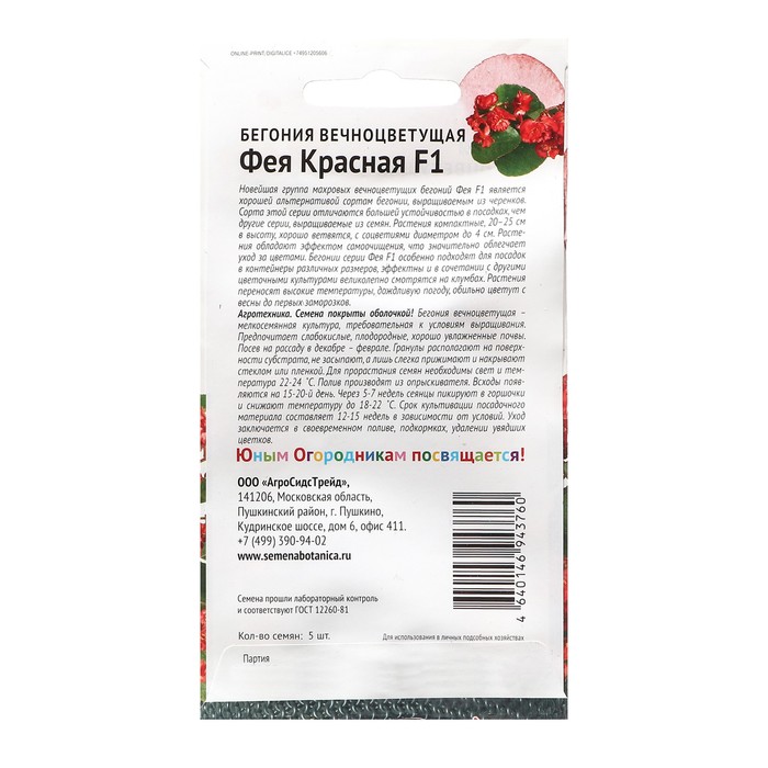 Семена Цветов Бегония "ФЕЯ", "Детская грядка" Красная,5 шт