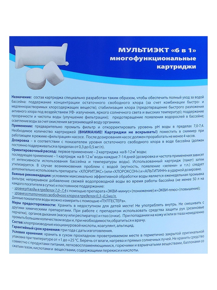 Применение: предварительно промыть фильтр и откорректировать уровень рН воды в пределах 7,0-7,4. Необходимое количество картриджей (ВНИМАНИЕ! Картриджи не вскрывать!) поместить в скиммер при работающем врежиме «фильтрация» насосе. После дозирования насос должен проработать не менее 4 часов. Дозировка - в соответствии с показателем уровня остаточного свободного хлора в воде бассейна (должен постоянно поддерживаться в пределахот 0,3 до 0,5 мг/л).