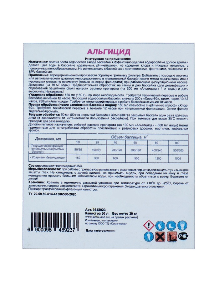 Средство предназначено против роста водорослей в воде бассейна. Эффективно удаляет водоросли на долгое время и делает цвет воды в бассейне идеальным, рН нейтрален, не содержит хлора и тяжёлых металлов, с пониженным пенообразованием. Не рекомендуется использовать в бассейнах с противотоками, фонтанами, гейзерами и в спа-бассейнах. Способ применения: перед использованием произвести обратную промывку фильтра. Добавлять с помощью мерника или автоматического дозатора непосредственно в плавательный бассейн около места подачи воды или в нескольких местах по периметру (только не перед фильтрами) при работающем циркуляционном насосе.