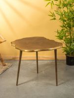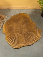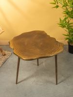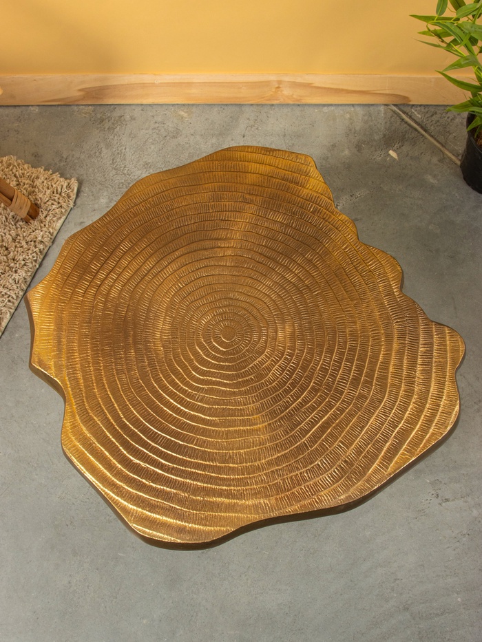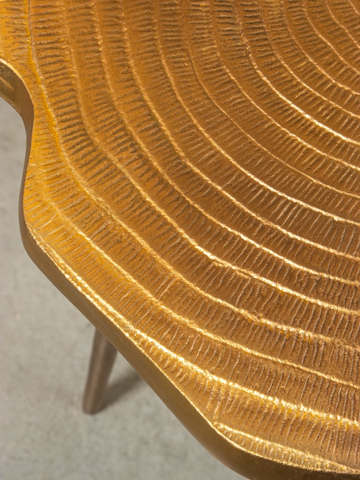 Журнальный столик «Лесной» из алюминия с уникальной фигурной столешницей 61?61 см, украшенной узором, напоминающим кольца на спиле дерева. Золотистый оттенок столешницы и изящных ножек создает эффект солнечного света, пробивающегося сквозь лесную листву. Высота 51 см идеальна для комфортного использования.