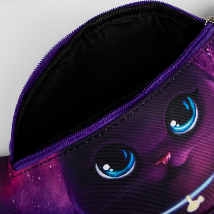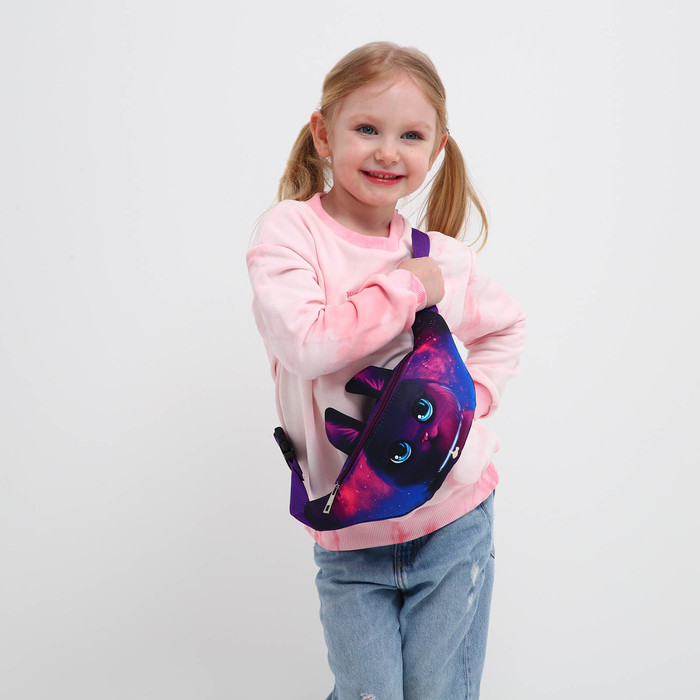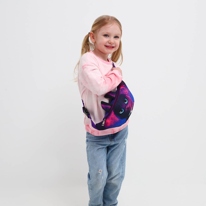 Цвет|Фиолетовый;Для кого|Для девочки;Вид застёжки|Молния;Материал|Металл;Материал|Полиэстер;Материал|Пластик;Модель сумки|Поясная;Изображение|Кот/Кошка;