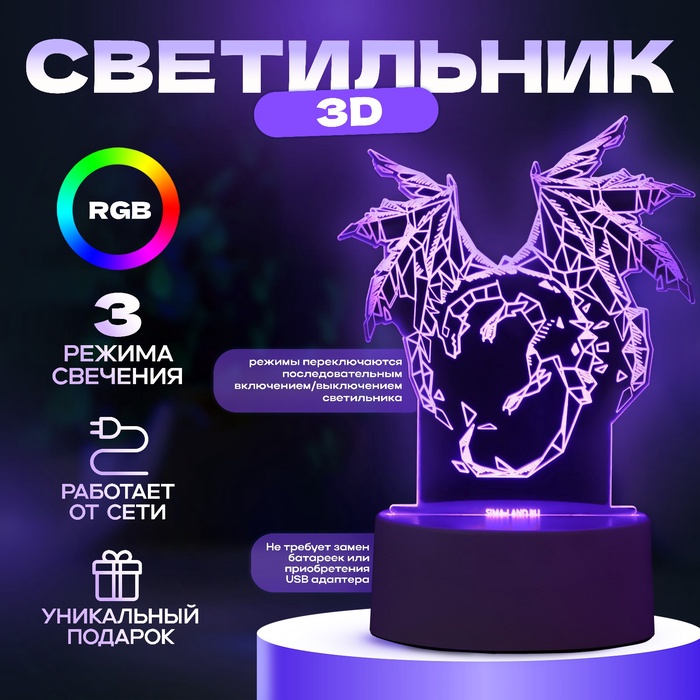 Светильник 3D ночник RISALUX «Дракон», LED RGB, от сети, 14.2?9.5?16 см