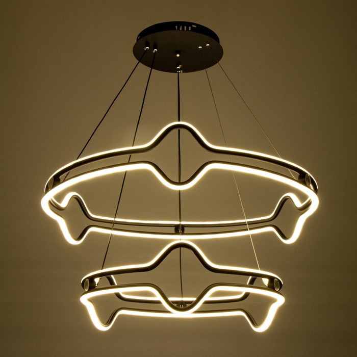 Вид лампы|Светодиодная;Количество ламп|2;Цоколь|Встроенные LED;Длина, см|70;Ширина, см|70;Высота, см|15;Площадь освещения, м²|30;Минимальная высота от потолка, см|50;Максимальная высота от потолка, см|90;Мощность на цоколь, Вт|320;Степень защиты|IP20;Назначение по помещениям|Гостиная;Назначение по помещениям|Спальня;Назначение по помещениям|Прихожая;Назначение по помещениям|Кухня;Назначение по помещениям|Кафе, рестораны;Материал основания|Металл;Цвет основания|Чёрный;Тип подвеса|Трос;Форма|Кольцо;Управление светильником|Без выключателя;Управление светильником|Без пульта;Подходит для натяжных потолков|Да (при использования светодиодных ламп);Тип крепления|На планку;Форма рассеивателя|Круглый;Стиль|Дизайнерский;Стиль|Модерн;Стиль|Современный;Тип источника освещения|Лампа в комплекте;