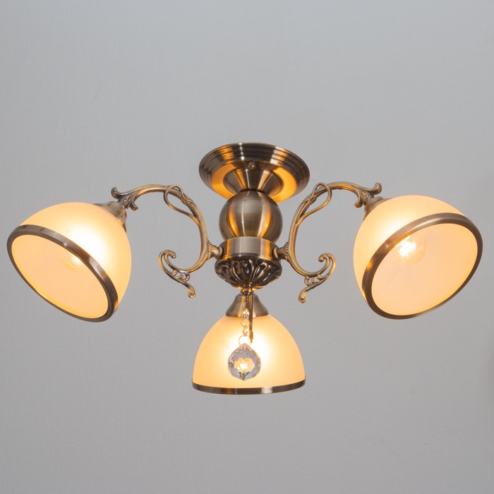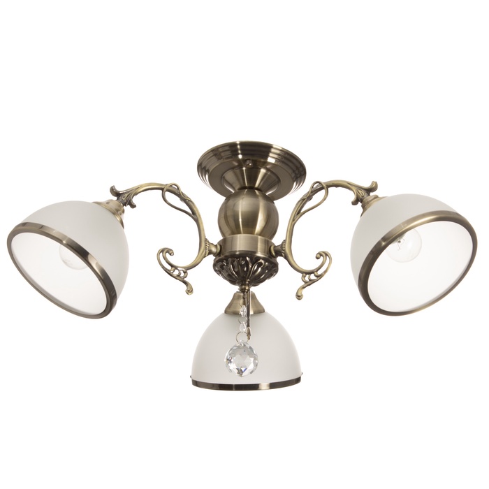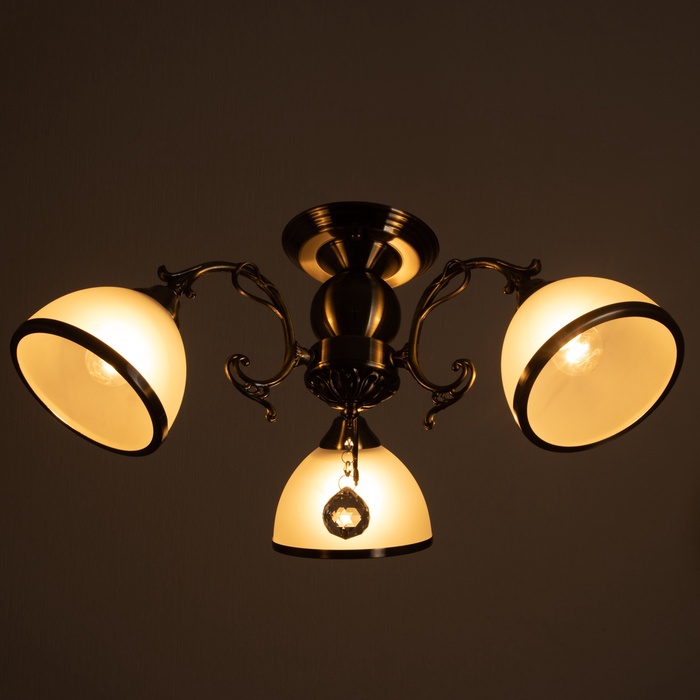 Вид лампы|Накаливания;Количество ламп|3;Стиль|Классика;Цоколь|E27;Длина, см|28;Длина, см|50;Ширина, см|48;Высота, см|28;Гарантийный срок, мес.|4;Площадь освещения, м²|6;Минимальная высота от потолка, см|28;Максимальная высота от потолка, см|28;Мощность на цоколь, Вт|40;Степень защиты|IP20;Назначение по помещениям|Спальня;Назначение по помещениям|Прихожая;Назначение по помещениям|Кафе, рестораны;Назначение по помещениям|Кухня;Назначение по помещениям|Гостиная;Материал основания|Металл;Цвет основания|Бронза;Тип рассеивателя|Плафон;Особенности светильника|Ветки;Тип подвеса|Штанга;Оттенок рассеивателя|Светлые тона;Форма|Круглая;Материал рассеивателя|Стекло;Управление светильником|Без пульта;Подходит для натяжных потолков|Да (при использования светодиодных ламп);Плоская|Нет;Тип крепления|На планку;Форма рассеивателя|Конусный;Направление рассеивателя|Вниз;Цвет рассеивателя|Белый;Стиль|Классика;Тип источника освещения|Лампа не в комплекте;