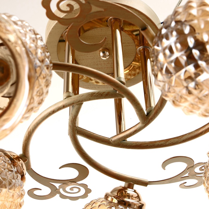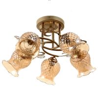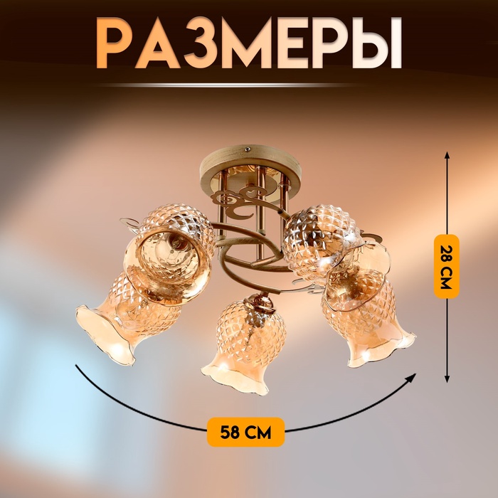 Вид лампы|Накаливания;Количество ламп|5;Стиль|Эконом;Цоколь|E27;Длина, см|58;Ширина, см|58;Высота, см|28;Площадь освещения, м²|10;Минимальная высота от потолка, см|28;Максимальная высота от потолка, см|28;Мощность на цоколь, Вт|40;Степень защиты|IP20;Назначение по помещениям|Гостиная;Назначение по помещениям|Спальня;Назначение по помещениям|Кухня;Материал основания|Металл;Цвет основания|Золотой;Тип рассеивателя|Плафон;Тип подвеса|Штанга;Оттенок рассеивателя|Цветные;Материал рассеивателя|Стекло;Управление светильником|Без пульта;Подходит для натяжных потолков|Да (при использования светодиодных ламп);Плоская|Нет;Тип крепления|На планку;Форма рассеивателя|Флористика;Направление рассеивателя|Вниз;Цвет рассеивателя|Янтарный;Стиль|Классика;Стиль|Прованс;Тип источника освещения|Лампа не в комплекте;