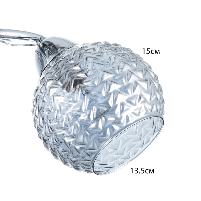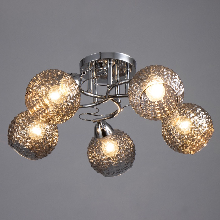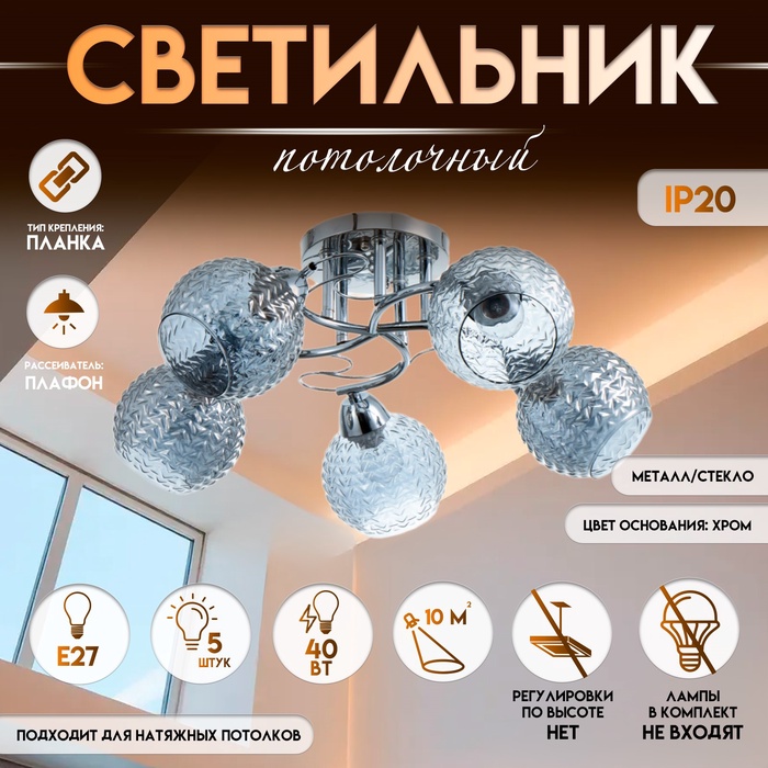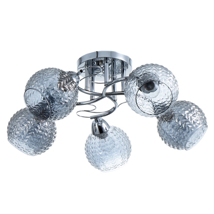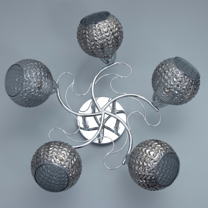 Вид лампы|Светодиодная;Вид лампы|Накаливания;Количество ламп|5;Стиль|Эконом;Цоколь|E27;Длина, см|56;Ширина, см|56;Высота, см|22;Площадь освещения, м²|15;Максимальная высота от потолка, см|22;Мощность на цоколь, Вт|40;Степень защиты|IP20;Назначение по помещениям|Гостиная;Назначение по помещениям|Спальня;Материал основания|Металл;Цвет основания|Хром;Тип рассеивателя|Плафон;Тип подвеса|Без подвеса (потолочный);Материал рассеивателя|Стекло;Управление светильником|Без выключателя;Подходит для натяжных потолков|Да (при использования светодиодных ламп);Тип крепления|На планку;Форма рассеивателя|Полушар;Цвет рассеивателя|Тонированный;Стиль|Минимализм;Тип источника освещения|Лампа не в комплекте;