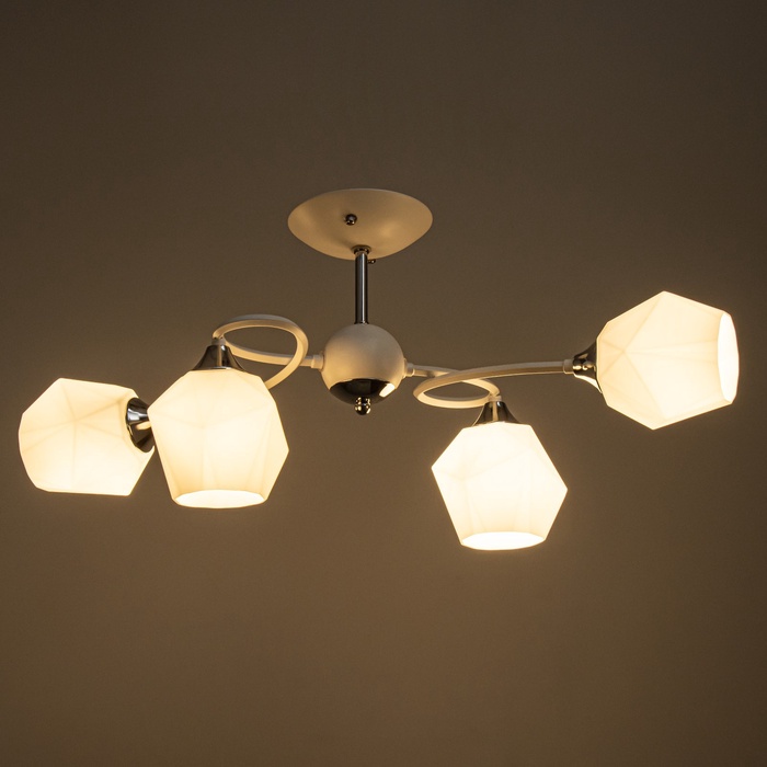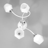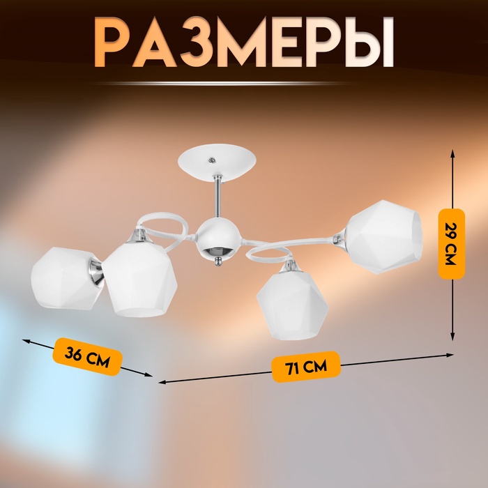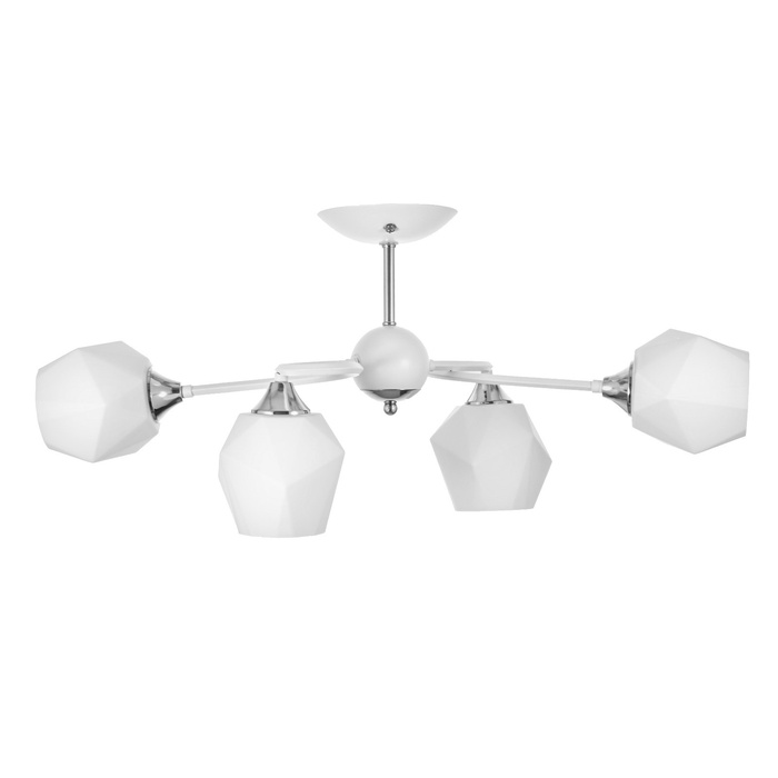Вид лампы|Накаливания;Количество ламп|4;Стиль|Модерн и хайтек;Цоколь|E27;Длина, см|71;Ширина, см|36;Высота, см|29;Площадь освещения, м²|12;Минимальная высота от потолка, см|29;Максимальная высота от потолка, см|29;Мощность на цоколь, Вт|40;Степень защиты|IP20;Назначение по помещениям|Спальня;Назначение по помещениям|Кухня;Назначение по помещениям|Гостиная;Материал основания|Металл;Цвет основания|Белый;Тип рассеивателя|Плафон;Тип подвеса|Штанга;Материал рассеивателя|Стекло;Управление светильником|Без пульта;Подходит для натяжных потолков|Да (при использования светодиодных ламп);Тип крепления|На планку;Форма рассеивателя|Многогранник;Цвет рассеивателя|Белый;Стиль|Модерн;Тип источника освещения|Лампа не в комплекте;