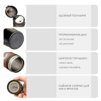 Термокружка является незаменимым атрибутом для всех любителей активного отдыха, её удобно брать с собой в поездку на автомобиле и мини путешествия на природу. Благодаря термокружке напитки остывают медленнее, чем в обычной чашке или картонном стаканчике: сохраняет напитки горячими до 8 часов, а холодными - до 12 часов.