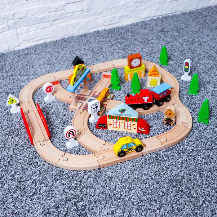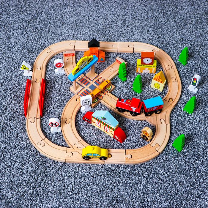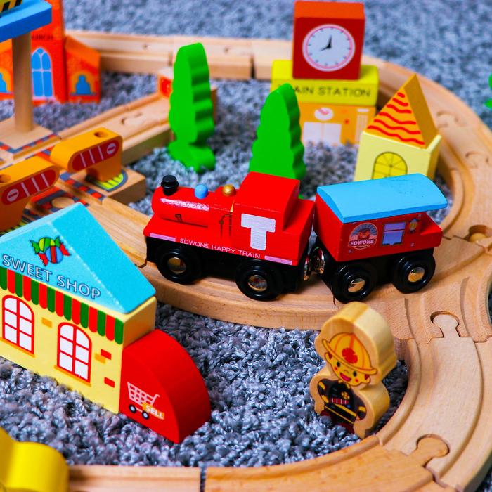 Тип питания|Без источника питания;Вид транспорта|Легковая машинка;Назначение транспорта|Железнодорожный (поезда);Цвет|Разноцветный;Для кого|Для мальчика;Возраст|От 3 лет;Количество вагонов|2;Количество элементов|60;Вид упаковки|Без упаковки;Тематика праздника|Универсальная тематика;Материал|Дерево;Материал|Металл;Материал|Пластик;Развитие навыков|Сюжетные игры;Дополнительные функции|Развивающая;Тип управления|Самоходный;Вид поезда|Классический;Особенности|Мост;Особенности|Окружение;Материал путей|Дерево;Среда перемещения транспорта|Наземный транспорт;