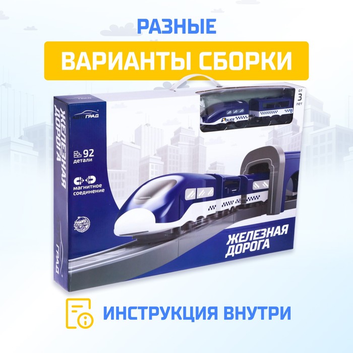 Железная дорога «Экспресс» поможет ребёнку почувствовать себя машинистом настоящего полицейского локомотива! Дополнительные машинки и вертолёт в наборе придут на помощь составу и помогут догнать преступников на земле и в небе. Дополнительные элементы в виде моста и туннеля сделают игру реалистичной и интересной. Это не просто игрушка, а уменьшенный прототип реального поезда, который представляет собой железнодорожный состав с несколькими вагонами.