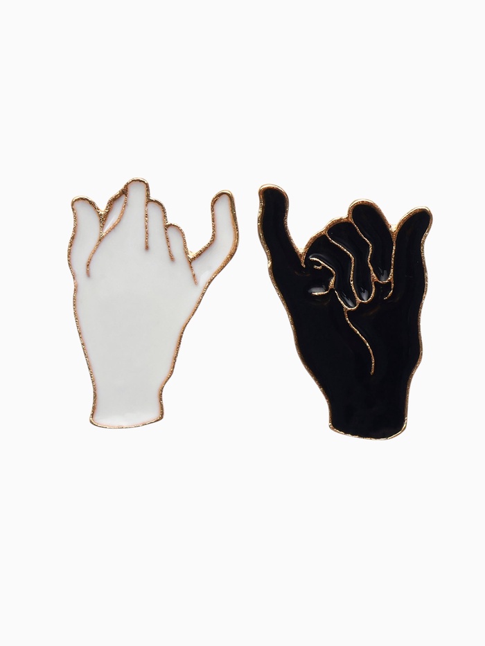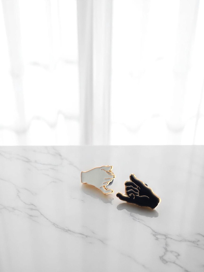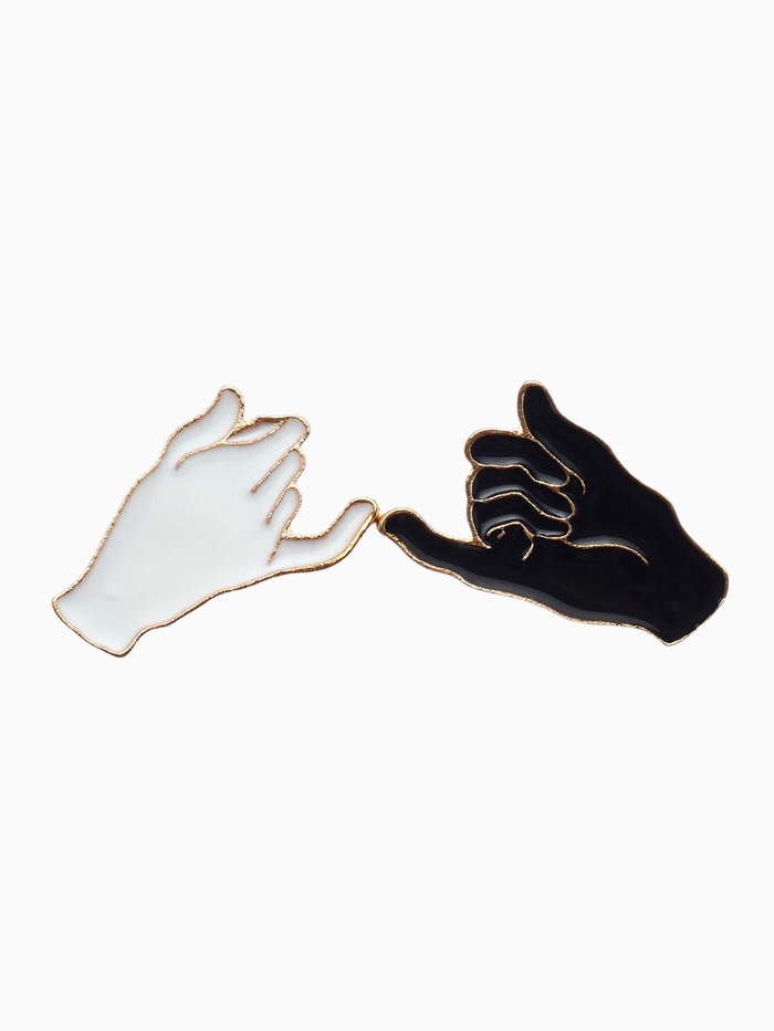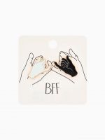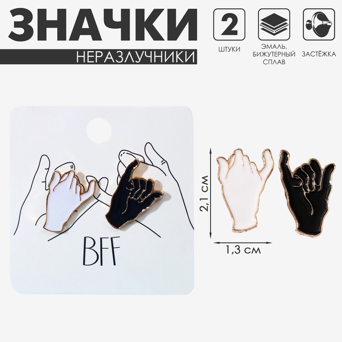 Два значка, объединённые идеей настоящей дружбы, воплощают стиль и искренность в каждой детали. Чёрно-белая гамма в сочетании с золотой фурнитурой создаёт эффектный контраст, который подчёркивает уникальность каждого аксессуара и одновременно символизирует гармонию и близость между лучшими подругами.